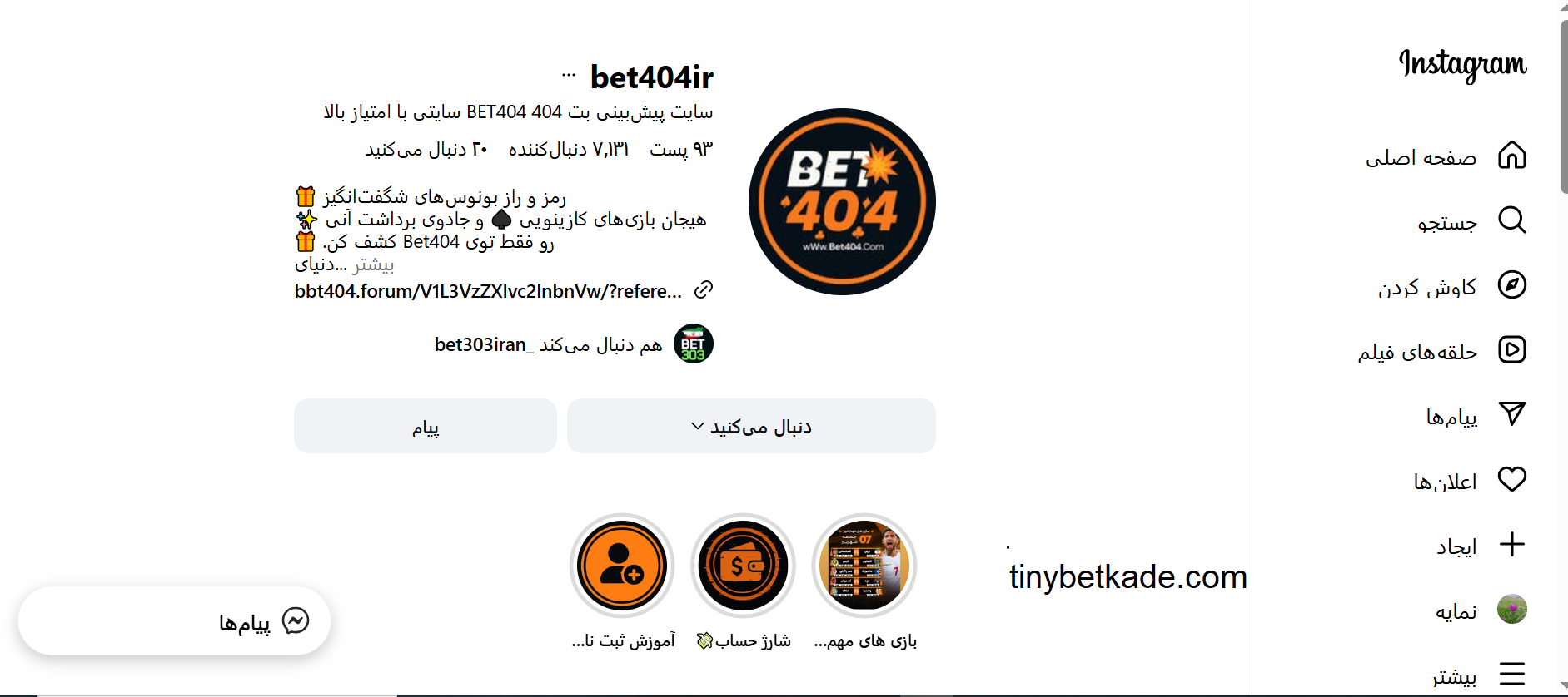 نحوه ورود به صفحه رسمی Bet404 در اینستاگرام